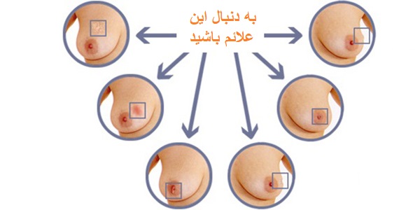 ۴ تغییرات نوک پستان از علائم سرطان سینه : در بعضی افراد فرورفتگی نوک پستان ممکن است بعد از شیردهی یا پس از دوران بلوغ ایجاد شود که معمولاً به طور خود به خودی و یا با دستکاری خود فرد به حالت اول برمی گردد. در حالیکه در سرطان، این فرورفتگی حالت ثابت دارد و با معاینه دقیق پستان ممکن است وجود غده ای در زیر نوک و هاله پستان مشخص شود. قرمزی و خارش نوک پستان همراه با پوسته پوسته شدن و ترک خوردن آن، می تواند علامت نوعی از سرطان پستان به نام پاژه باشد مگر اینکه خلاف آن ثابت شود.