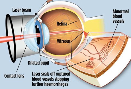 در بعضی از افراد دیابتی عروق جدیدی در شبکیه ایجاد می شود که در واقع می خواهند جایگزین عروق مسدود شود. این عروق از نظر بافت شناسی طبیعی نبوده و عملکرد مناسب ندارند و حتی خونریزی از آنها می تواند باعث کوری فرد مبتلا خواهد شد. لیزر می تواند این عروق جدید را از بین برده و مانع از نابینایی فرد شود.